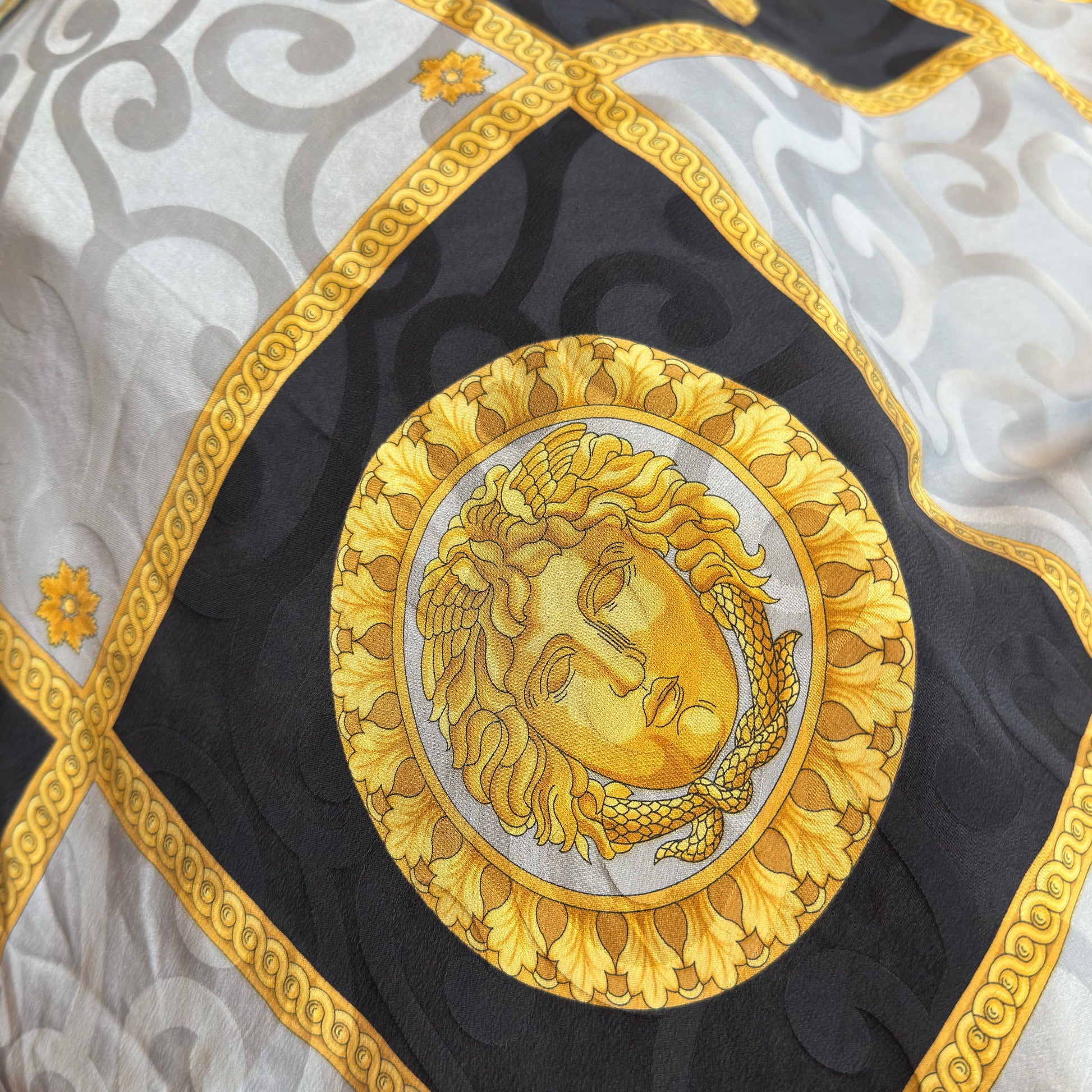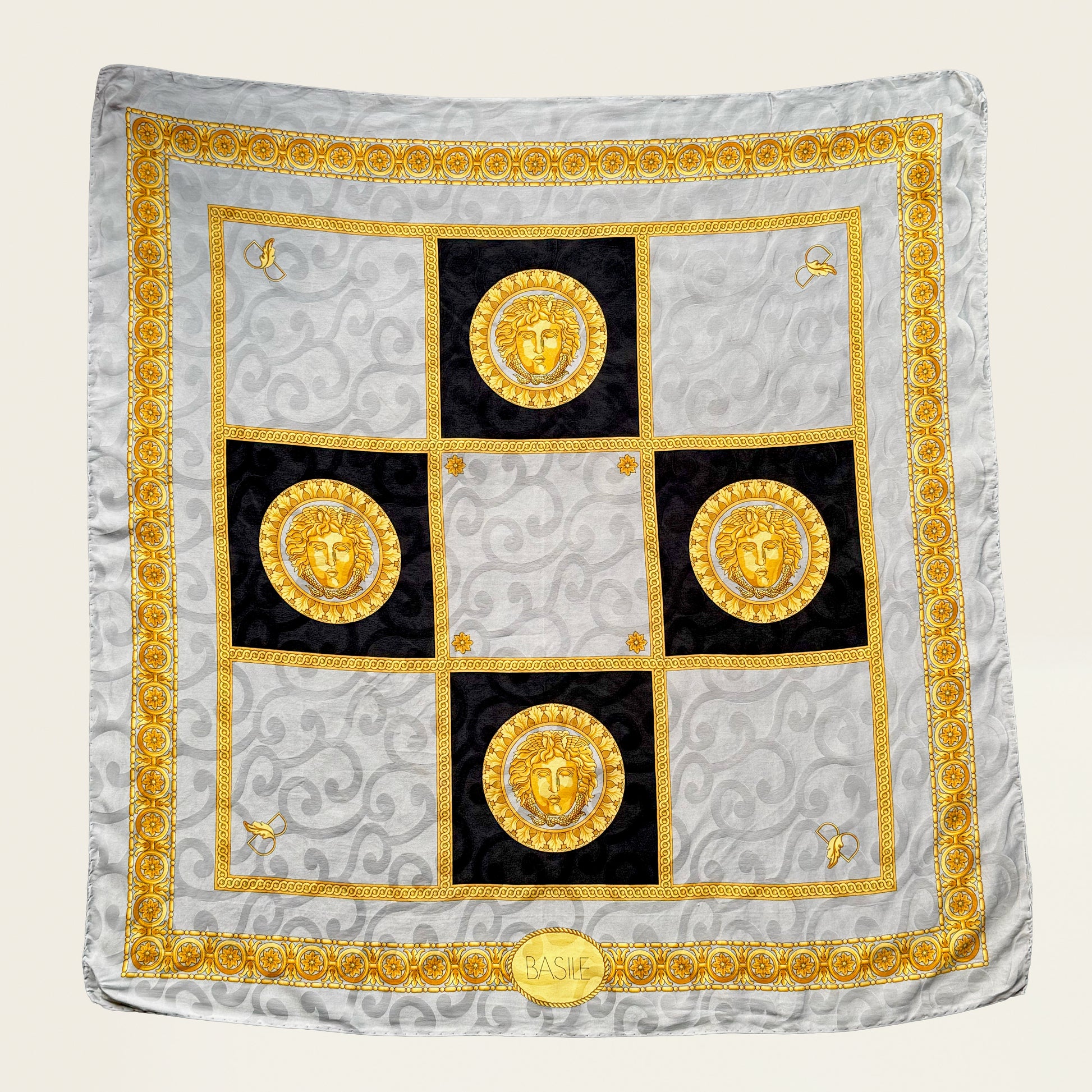 Vintage zijden sjaal van Basile, met een goud- en zwartkleurig Medusa-achtig ontwerp en een decoratieve rand.