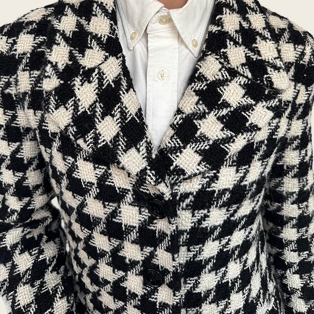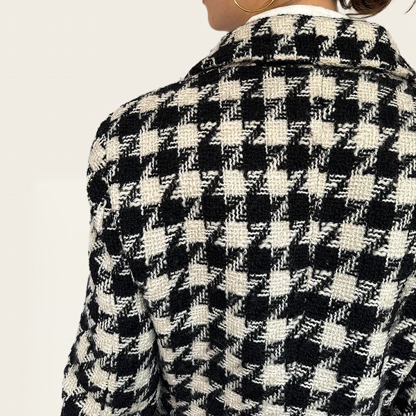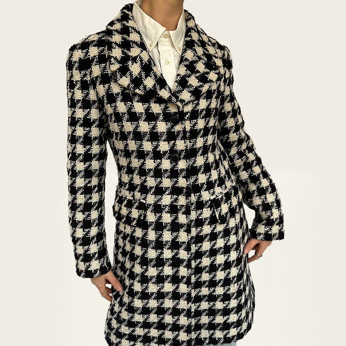 Elegante lange wollen jas van Moschino met pied-de-poule motief. Tijdloos silhouet met een verfijnde, statement uitstraling. Perfect voor klassieke, chique outfits of om een look extra karakter te geven. Een iconisch vintage item van hoogwaardige kwaliteit.