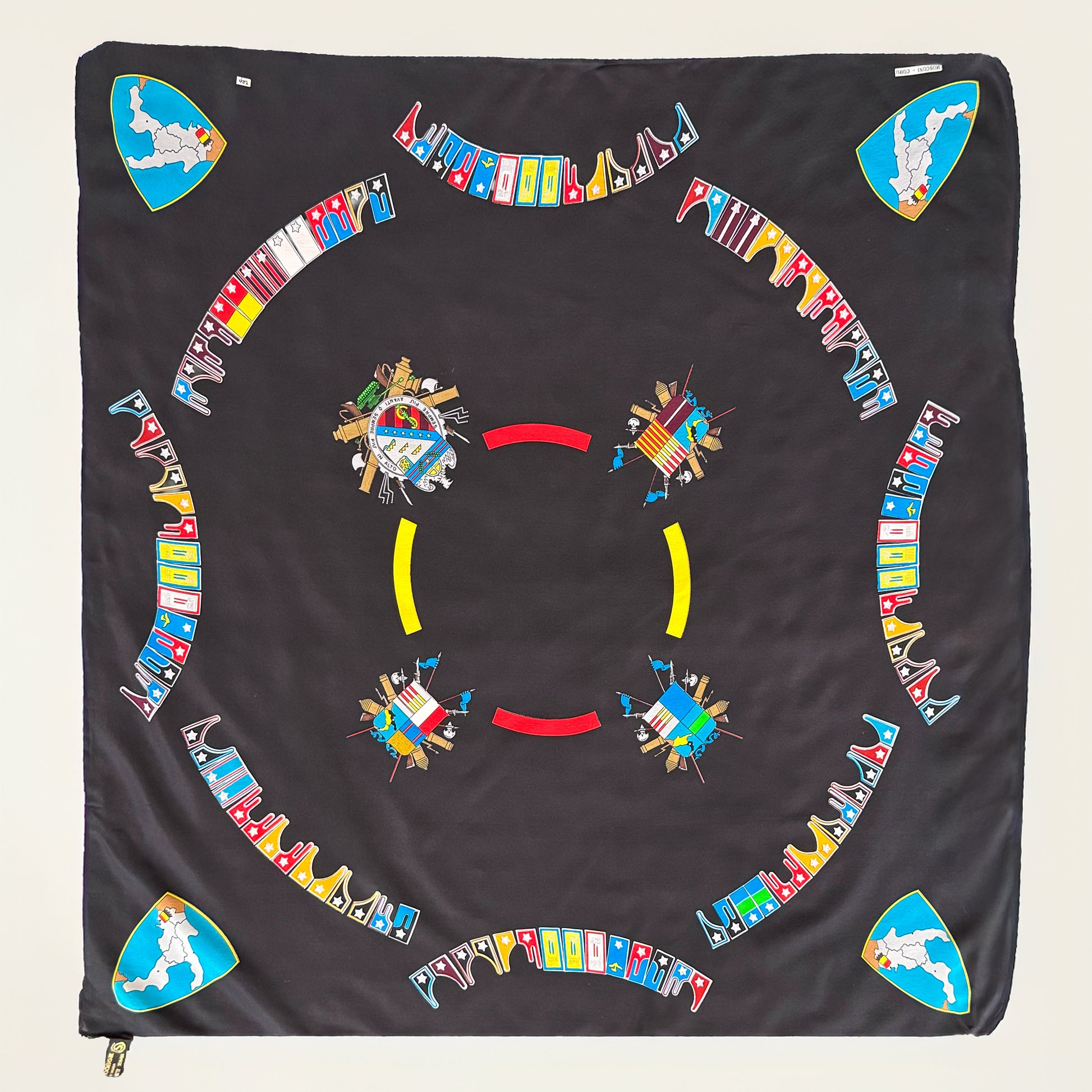 Deze opvallende Mosconi Como vintage vierkante zijden sjaal heeft een diepe zwarte basis en is versierd met een grafisch, symmetrisch ontwerp.