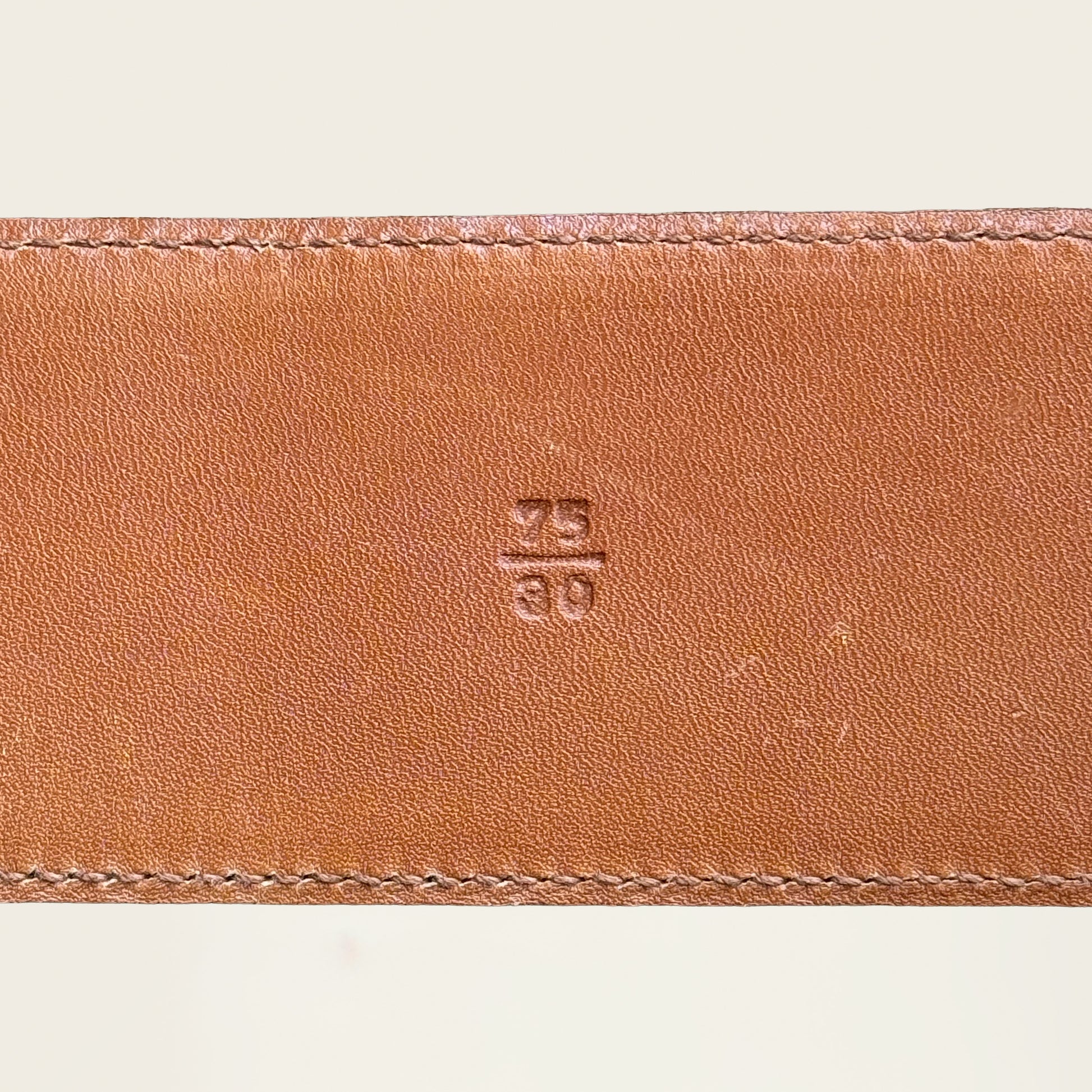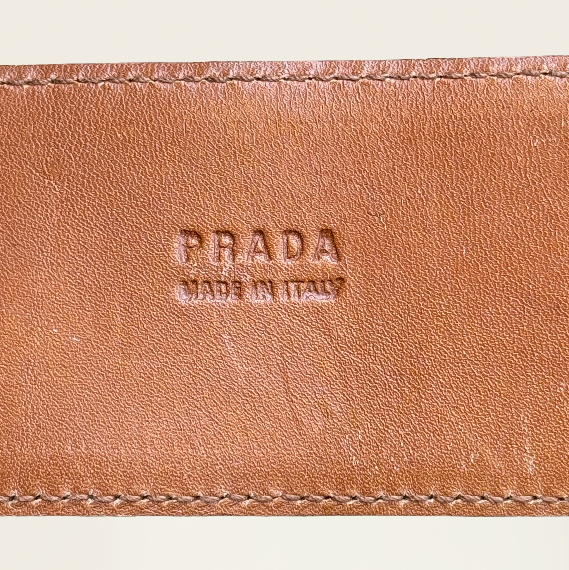 Elegante Prada riem uitgevoerd in hoogwaardig bruin leer met een verfijnde structuur. De riem is afgewerkt met een opvallende goudkleurige gesp en dubbele riemlus, wat zorgt voor een luxueuze en tijdloze uitstraling. De warme cognackleurige binnenkant en de contrasterende stiksels benadrukken het vakmanschap waar Prada om bekendstaat.