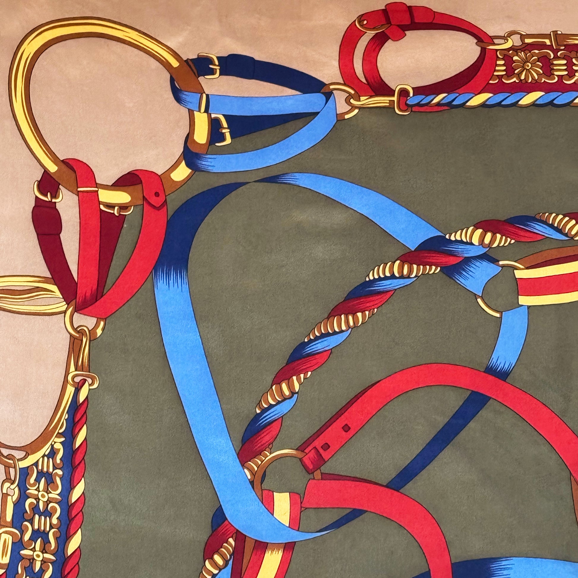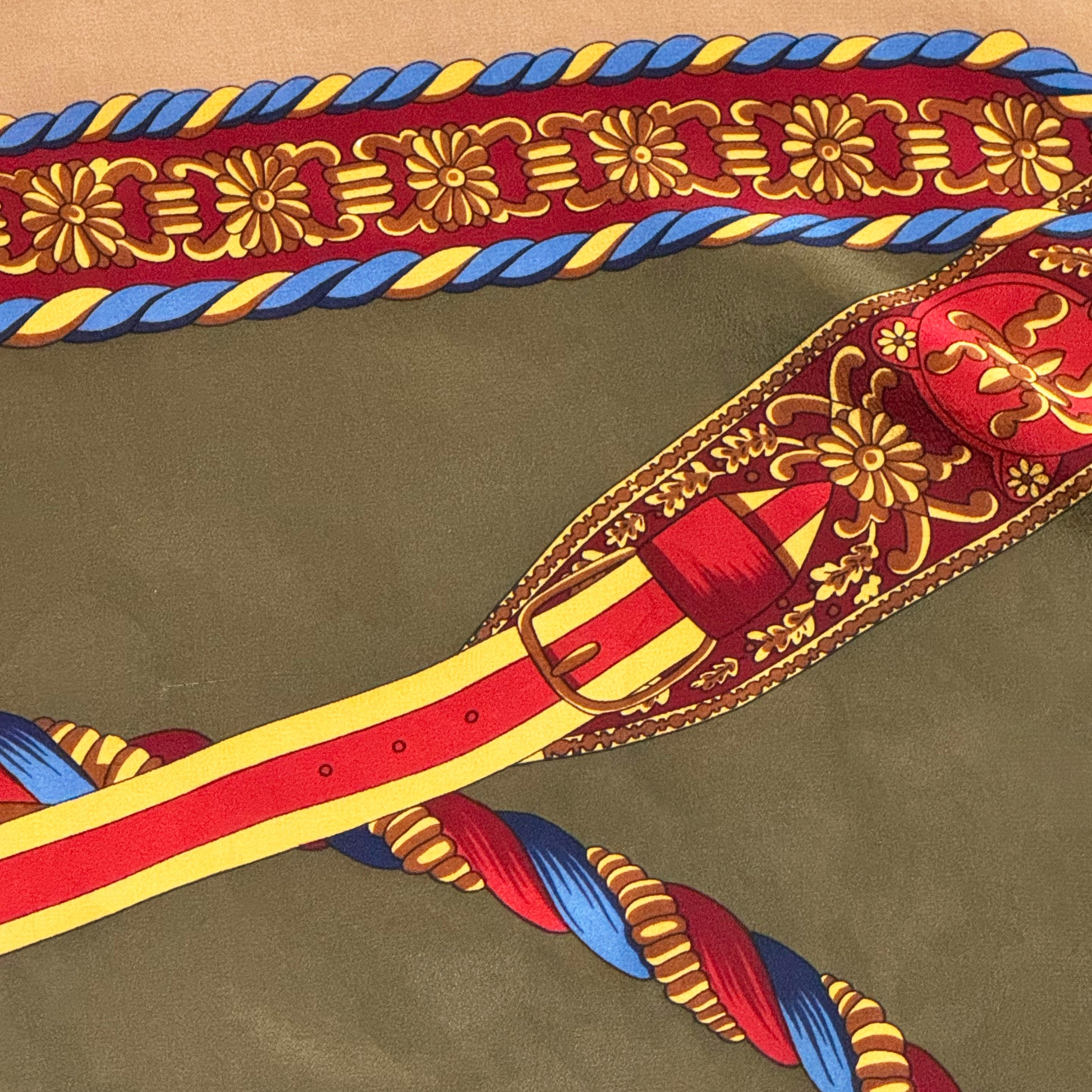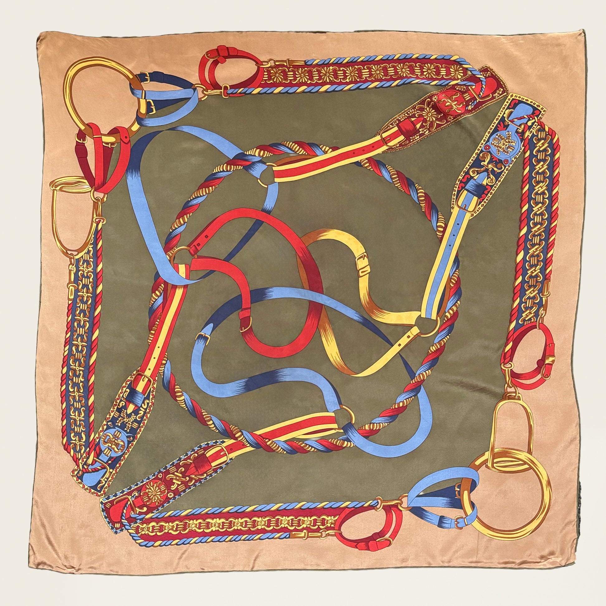 Deze stijlvolle vierkante zijden sjaal heeft een klassiek en tijdloos ontwerp met een rijke compositie van decoratieve riemen, koorden en gespen.